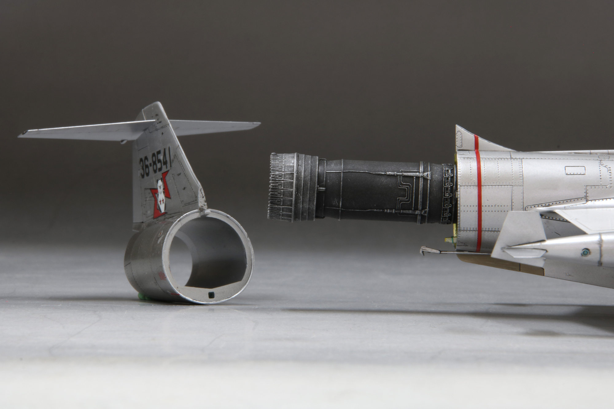左サンプル画像は、コクピットやエアインテークからエンジンまでのダクトを確認するために、部品を意図的に切除したカットモデルです。 |