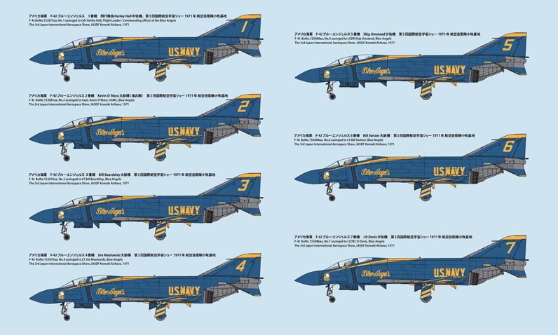 ブルーエンジェルスは、アメリカ海軍で1946年に組織されたアクロバットチームです、空軍のアクロバットチーム「サンダーバーズ」とはライバル関係のように、共に世界中の航空ファンを魅了しています。F-4Jは1969年から`74年までのシーズンで使用され、`71年秋には創設25周年を記念した極東ツアーをおこない、日本では愛知県小牧基地にてデモンストレーションを実施しています。