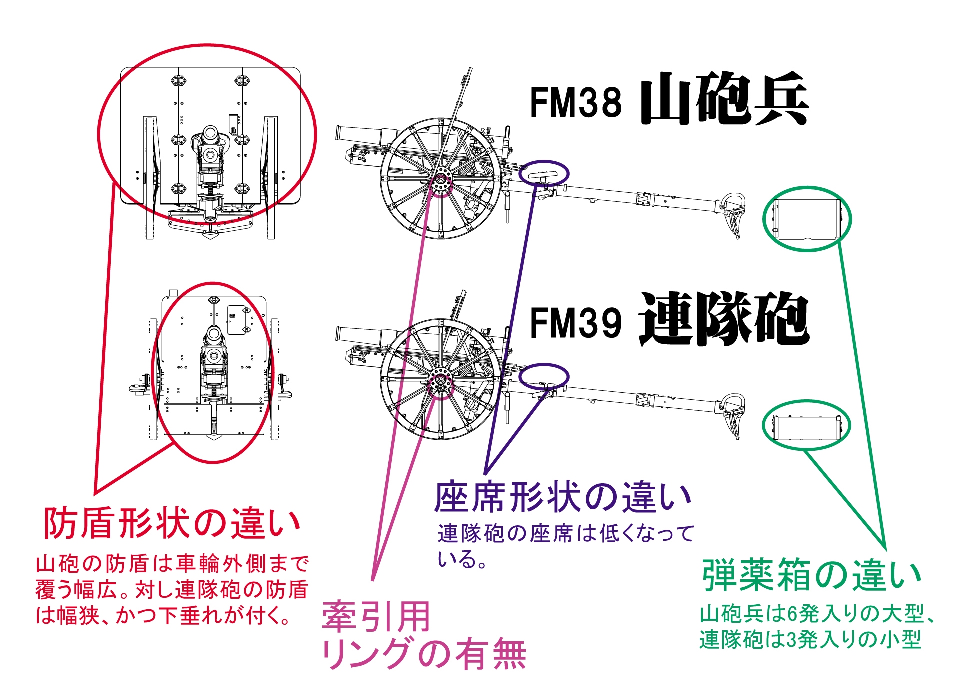 四一式山砲 山砲兵用と歩兵連隊砲との違い(下図をクリックすると大きい画像が表示されます)
