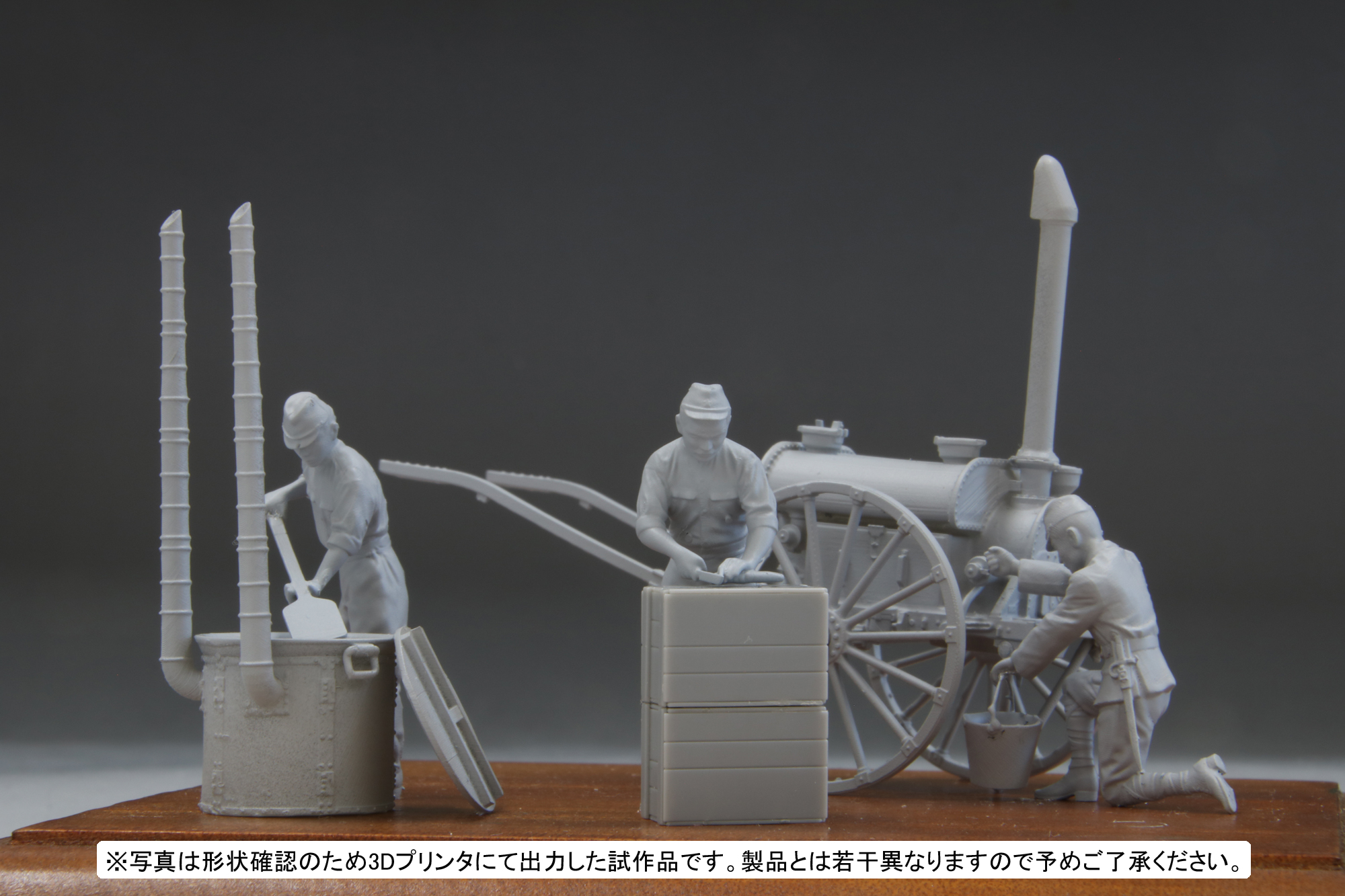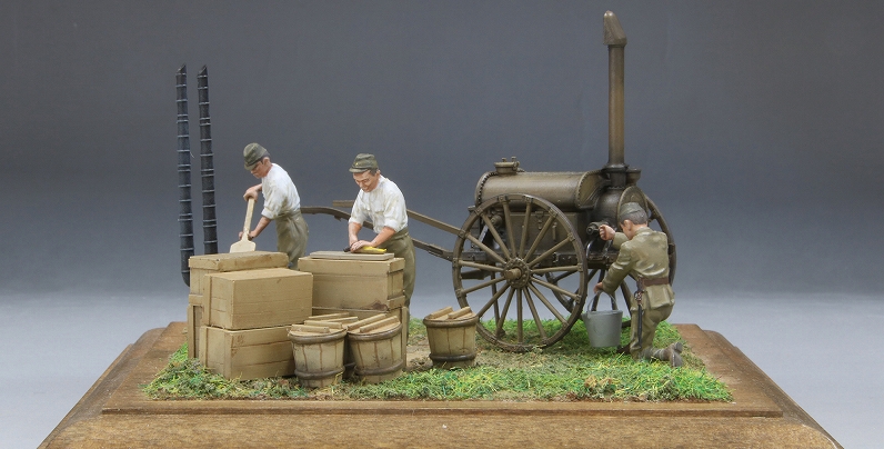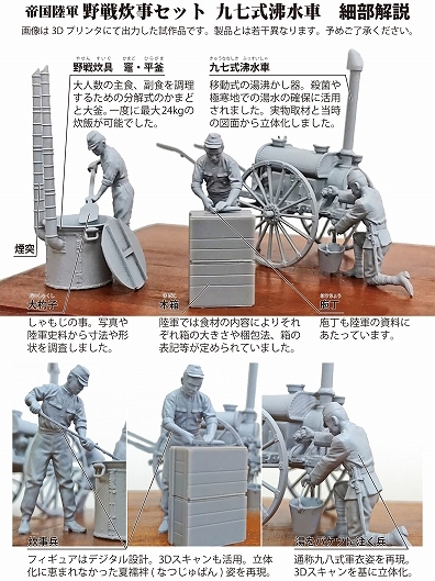 また、大杓子を持ちかまどで調理する姿の兵隊、庖丁でたくあんを切る兵隊、沸水車からバケツに湯を注ぐ兵隊といった、3体の表現豊かなフィギュアをセットします。