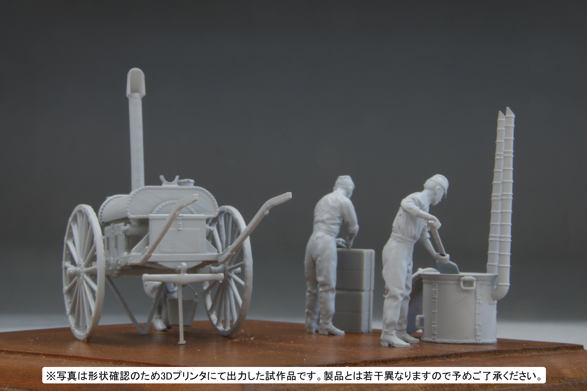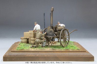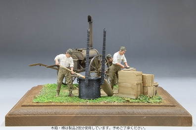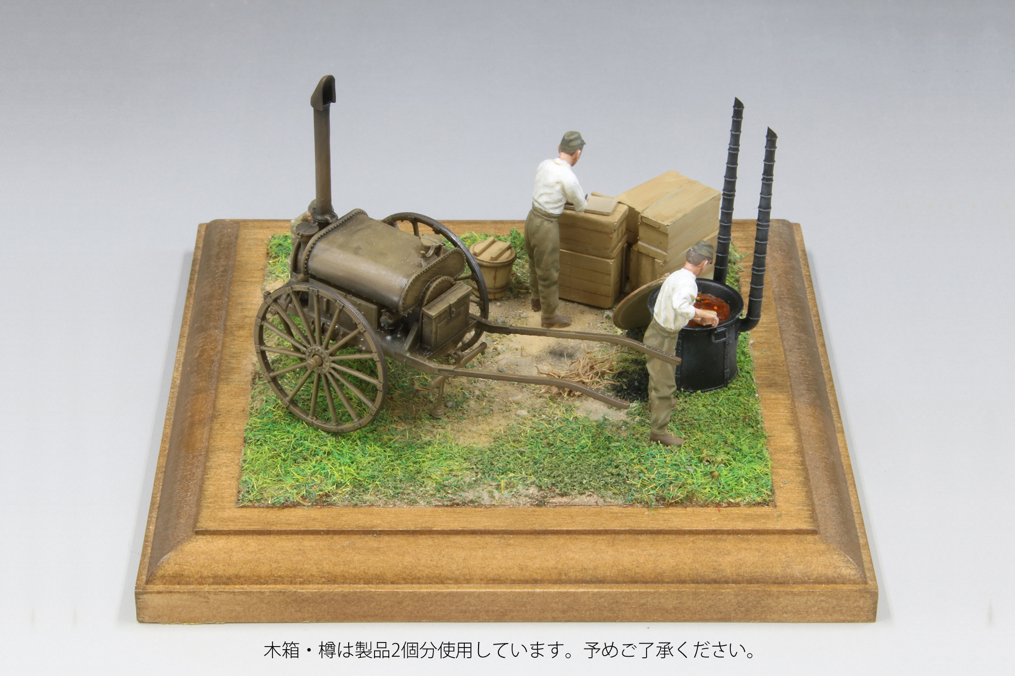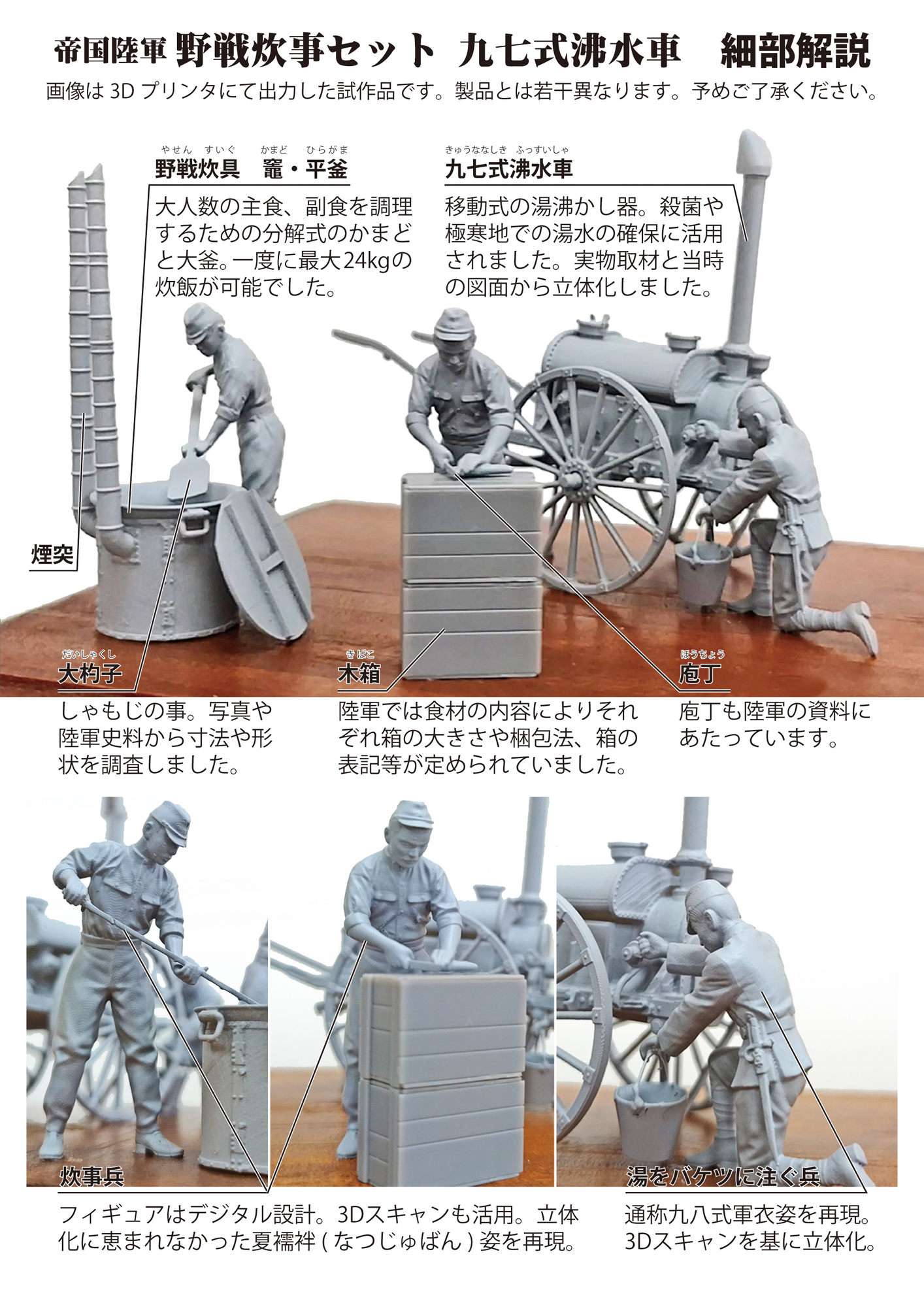 腹が減っては戦が出来ぬということわざ通り、戦場においても最も重要なもののひとつが食事です。大戦中の日本陸軍における野戦炊事は飯ごう炊さん主でしたが、1時間に約300食の炊飯等が可能という大人数用の野戦炊具・調理具も使用されていました。当キットではこの野戦炊具の竃(かまど)・釜(かま)・大杓子(しゃくし=しゃもじ)などを立体化。あわせて移動式の湯沸かし器である九七式沸水車もセットします。戦場では温かい飲食物が精神の疲労を和らげると言われ、さらに煮沸殺菌、寒冷地における水の凍結防止などに沸水車は活躍しました。