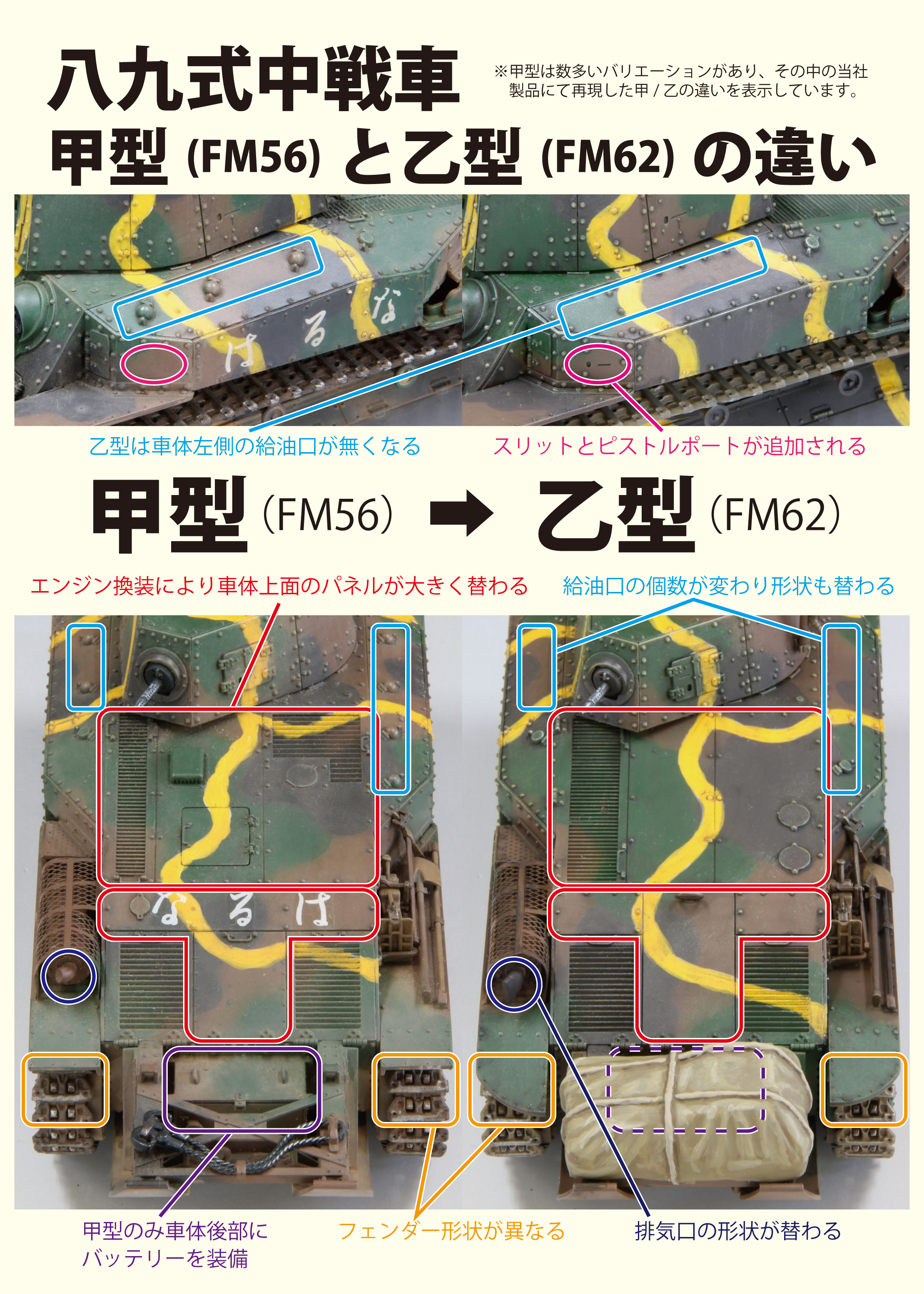 日本における最初の制式戦車である八九式戦車は、開発当初にはガソリンエンジンを搭載していましたが、水の確保が難しい大陸での運用を想定し冷却水が不要かつ燃費の向上、さらに燃料漏れなどによる車体炎上の危険性を減らすことも出来る『空冷ディーゼルエンジン』に換装されます。このエンジンが換装されたタイプが乙型と呼ばれ、それまでのガソリンエンジン搭載車両は甲型と呼ばれ区別されました。当キットでは乙型の特徴でもある車体上面の給油口など違いを細かく再現しています。さらに当時の写真でよく見られる、車体後部の尾体に乗せられたシートにくるまれた荷物をプラスチック製パーツにてモデル化。情景に映える姿を再現する事ができます。