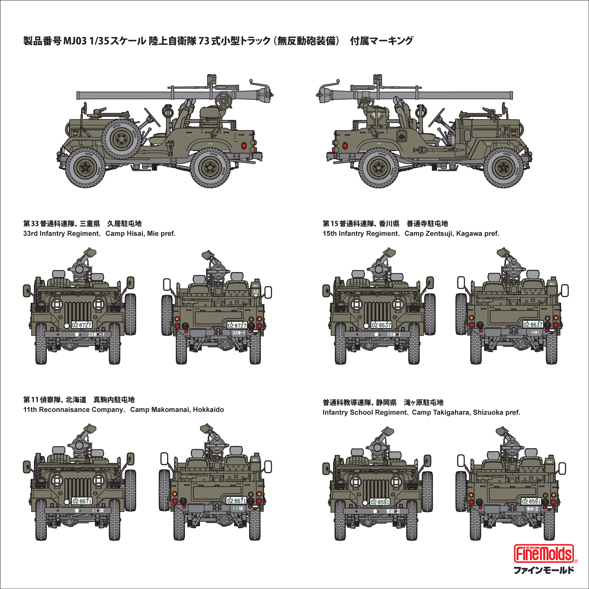 第33普通科連隊、善通寺駐屯地 第15普通科連隊、真駒内駐屯地 第11偵察隊、滝ヶ原駐屯地 普通科連隊の所属車両に対応。さらに、ナンバープレート用の単体数字デカールも付属しており、付属マーキング以外の車両も作成が可能です。