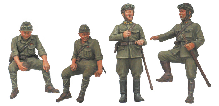 キットの内容は昭和十三年に改正された九八式軍衣の将校と下士官各1体と、作業服着用で談笑している兵2体の計4体入りです。塗装では再現が難しい階級章デカールも付属。日本軍戦車などと組み合わせてご使用ください。 |