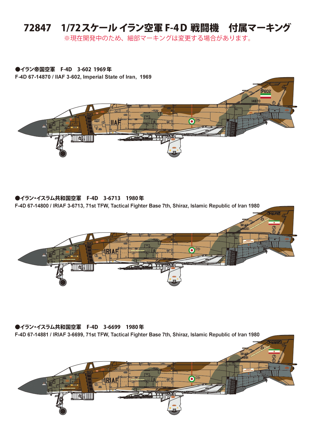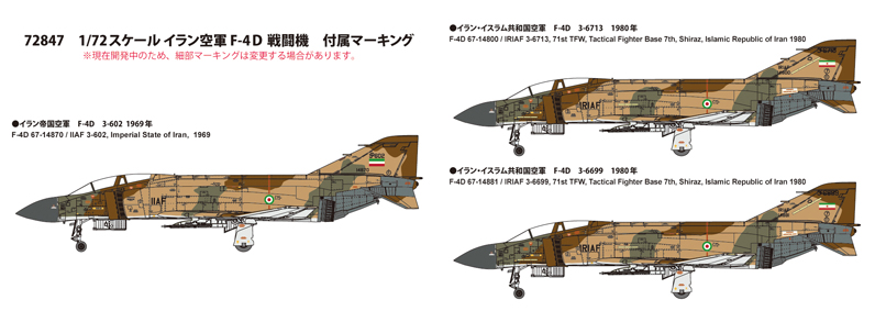 | 1978年以前のイラン帝国において、時の国王であるパフラヴィー2世(パーレビ)は中東地域の軍事的優位を計ると共に隣国ソ連への警戒感から、いわゆる「オイルマネー」により西側諸国から多数の陸上・航空兵器を購入しました。航空兵器においては1967年にF-4Dが発注され、ベトナム戦争の最中にもかかわらず新造された32機が`70年までに納入されています。1979年2月に起こったイラン革命によりパフラヴィー2世が退陣、反米色の強いイラン・イスラム共和国が設立するとアメリカは武器禁輸措置を採り、交換用部品も含めその後の供給は断たれますが、稼働機減少に悩まされながらも両機種共に`80年から始まるイラン・イラク戦争に従事。F-4Dは近年まで稼働が確認されています。限定品。 |