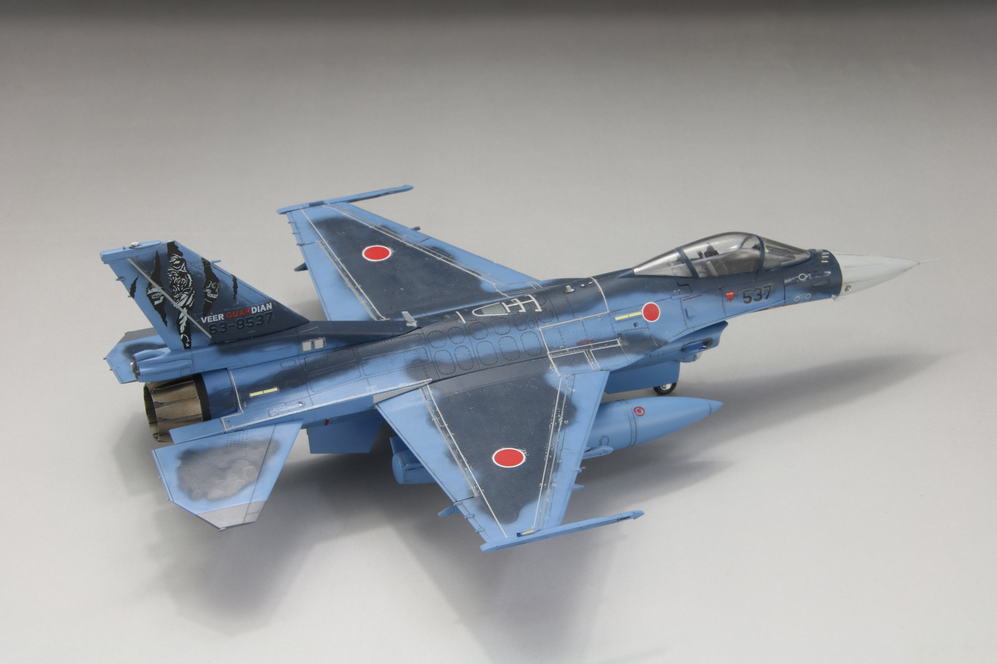 | 2023年1月16日から26日にかけて行われた航空自衛隊とインド空軍による初の戦闘機共同訓練『VEER GUARDIAN2023』にて披露されたスペシャルマーキング機を再現。共同訓練終了後はすぐに剥がされてしまったというスペシャルマーキングは、共同訓練に参加した3部隊それぞれの部隊マークと「今訓練が歴史のうえで爪跡を残す」との意味も込め組み合わされたデザインとのこと。本キットでは単座型のF-2A(23-8537号機)を再現すべくオリジナルデカールが付属します。 限定品。 |