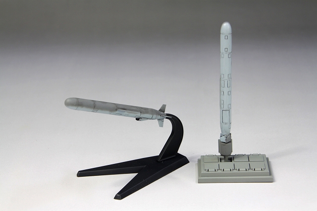 | 巡航ミサイルの代名詞「トマホーク」が完全新金型にて登場。キットでは主翼、尾翼が展開された飛行状態と発射時の主翼、尾翼が折りたたまれた状態の2発入り。ベースもそれぞれ専用の物が付属します。発射時用の台座は垂直発射装置上部を模した形状で再現。主翼・尾翼は薄く精密にパーツ化するなど各部を繊細に再現しました。 |