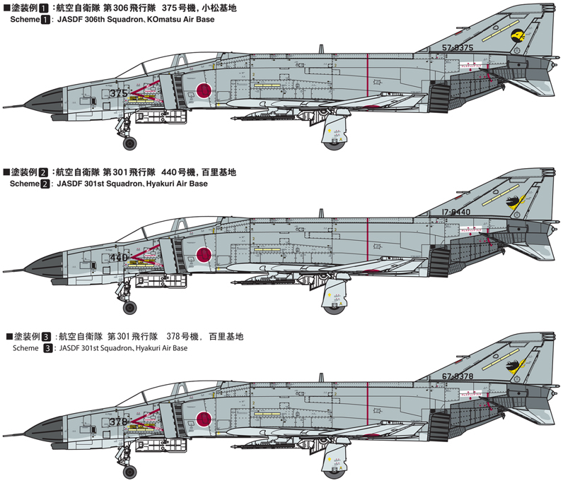 本製品においてもこれらのF-4EJと異なる各部位を別々に再現しました。特に重要な差異であるコクピット内部の計器パネルは専用部品にて再現。彫刻にて計器形状を再現したパーツと、デカールが貼付しやすい無彫刻の計器パネルを用意。加えてパーツ分割の設計、精密再現を施しながらも可能な限り抑えた部品点数など組み立てやすさを考慮しています。マーキングは第306飛行隊の375号機と、F-4戦闘機の最終生産機でもある百里基地の440号機(俗称ししまる)が付属します。 |