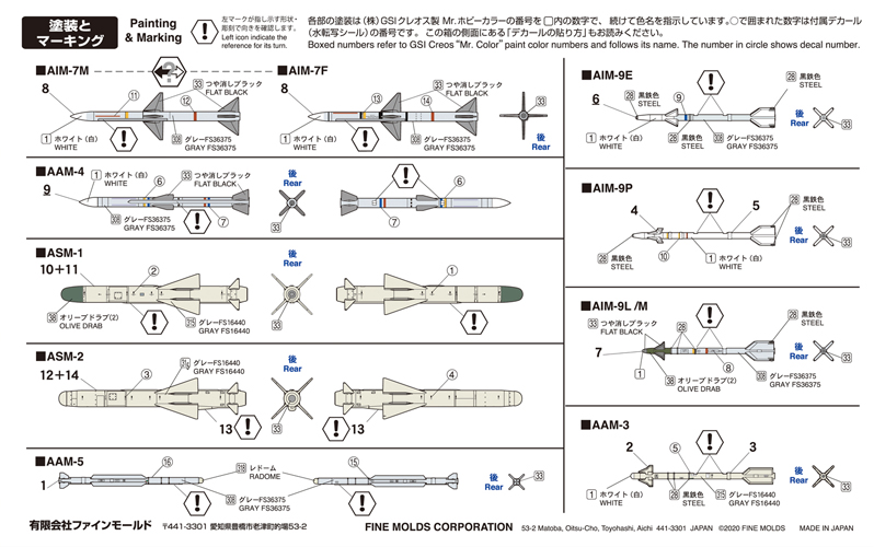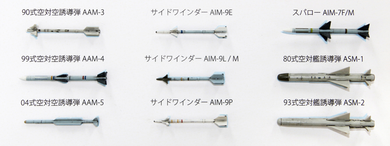 セット内容は、90式空対空誘導弾(AAM-3)、99式空対空誘導弾(AAM-4)、04式空対空誘導弾(AAM-5)、スパロー(AIM-7F)、サイドワインダー(AIM-9E、AIM-9L/M、AIM-9P)、80式空対艦誘導弾(ASM-1)、93式空対艦誘導弾(ASM-2)