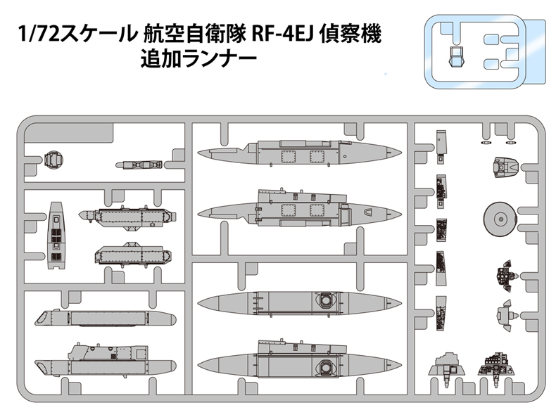 当キットではこの偵察用ポッド3種・ECMポッドに加え、計器盤もRF-4EJ専用のとして新金型にて追加します。偵察用ポッドのカメラ部はクリアーパーツを用いて実感を高めています。 |