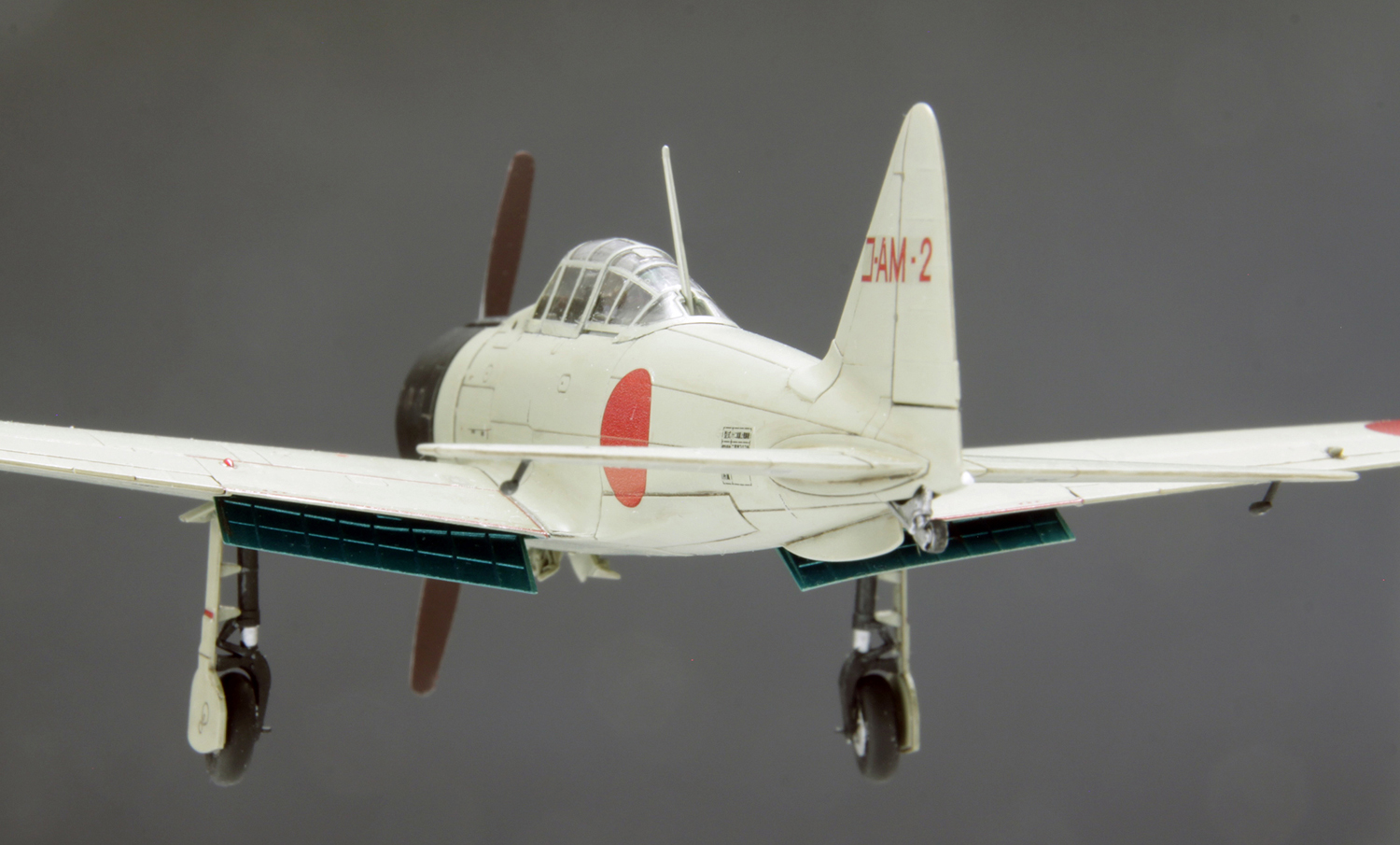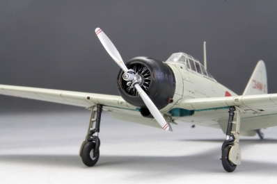 さらに、制式採用後の零戦とは一線を画す多数のディテールが存在します。わずかに短い胴体、独特なカウリング形状、前傾したアンテナ支柱、異なる垂直尾翼の輪郭、胴体後部下に装備されたフィン、突出型マスバランス付きの水平尾翼など、細部にわたって異なる試作機ならではの姿が確認できます。 |