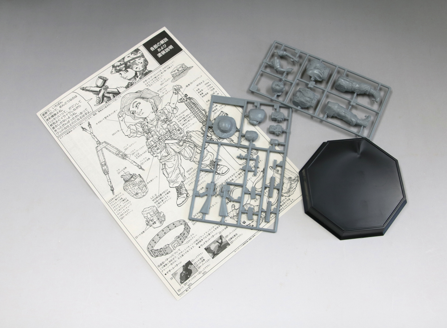 | 漫画家・鳥山明氏のデザインと監修による兵士たちです。コミカルにディフォルメされたフィギュアをプラスチックモデル組み立てキットで立体化。銃や装備品は出来る限り1/12スケールで正確に再現し、かつ実物資料や写真等による考証をしています。貴重な鳥山氏描きおろし作品による装備品の解説書も付いています。台座付。 |