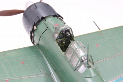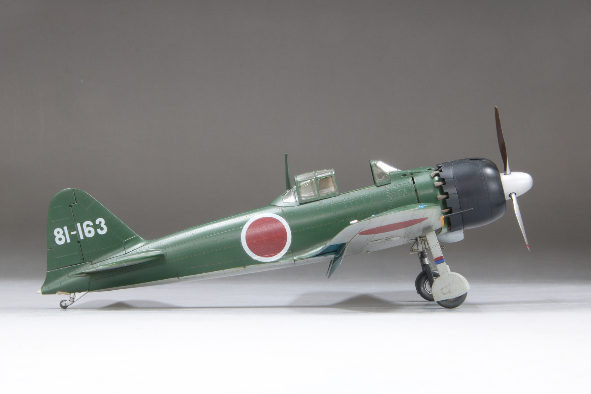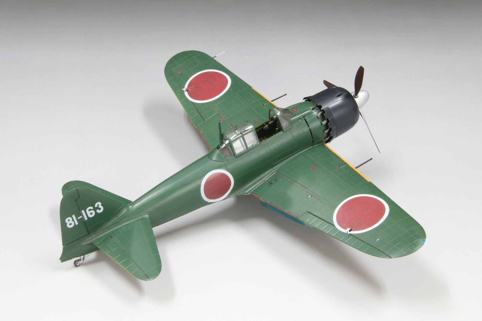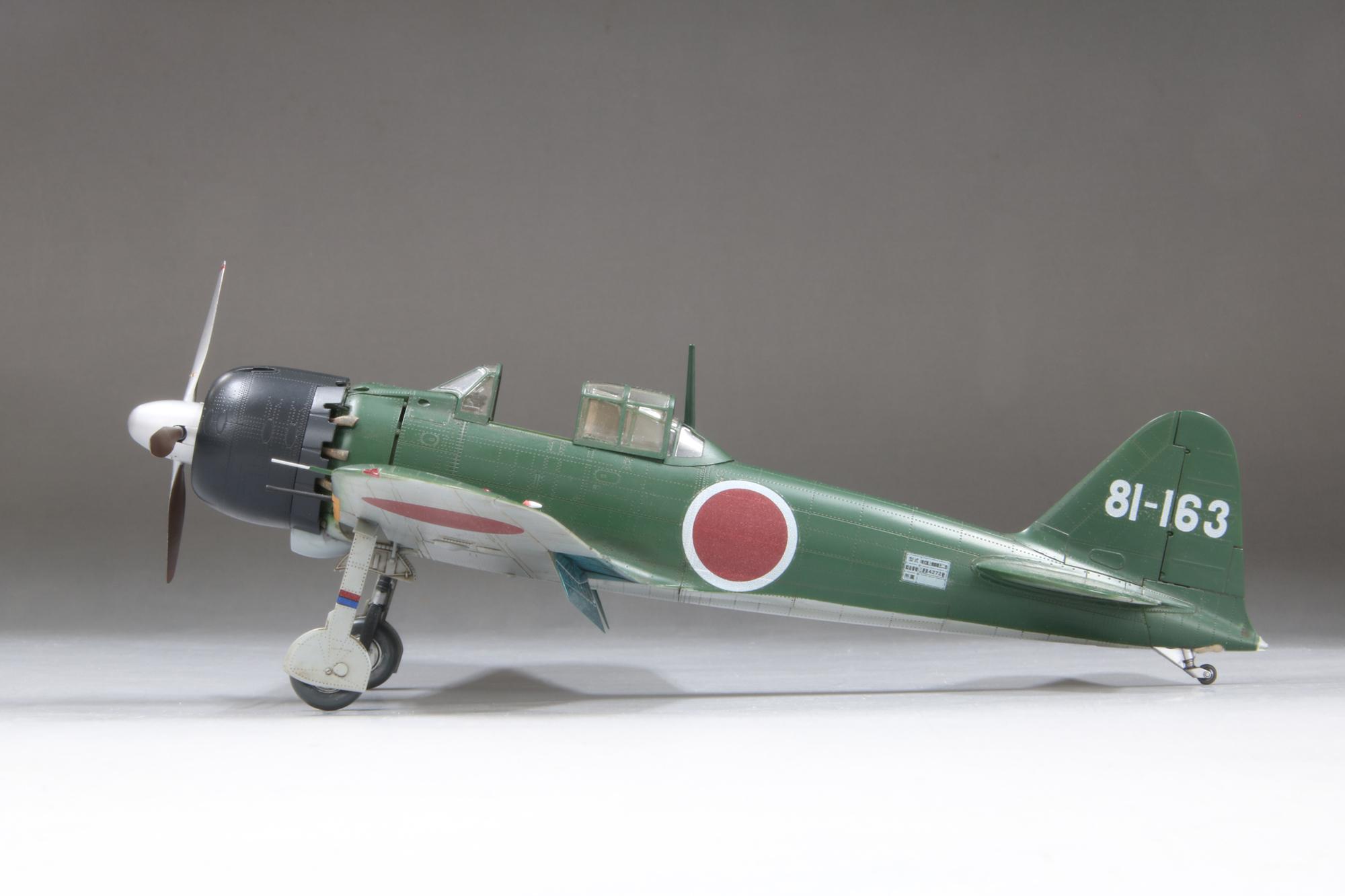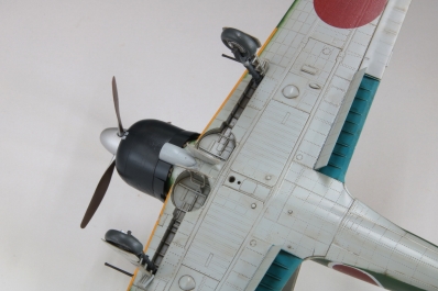 最初の量産型として一一型が登場した以降も順次改良がなされ、五二型はおおむね5番目のタイプとなります。速度向上を狙い三二型で短くした主翼から翼端を丸く整形したことが特徴です。開発元の三菱重工業で生産された五二型はさらに初期型・中期型・後期型に分類され、今回モデル化する三菱製中期型は、推力式単排気管への変更直後で、各排気管が位置する胴体に耐熱板が装着される以前の姿を再現しました。 |
