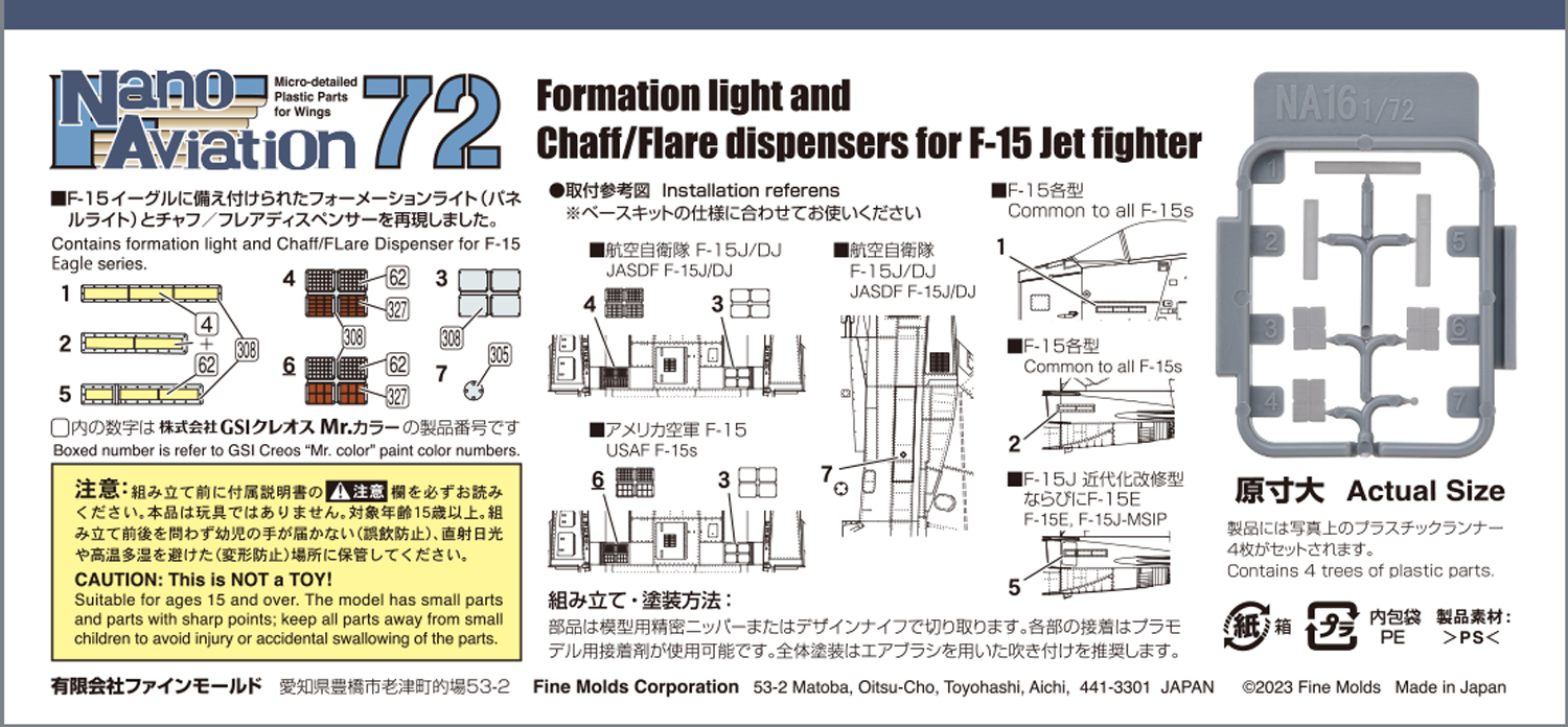 F-15戦闘機各タイプに対応した機体側面に装備された長方形のフォーメーションライトと、チャフ/フレアディスペンサーを精密プラパーツで再現。1/72にて好評発売中アイテムの1/48版です。極薄のプラパーツは立体感と精密感を際立たせます。2025年完全新金型。2機分入り。 |