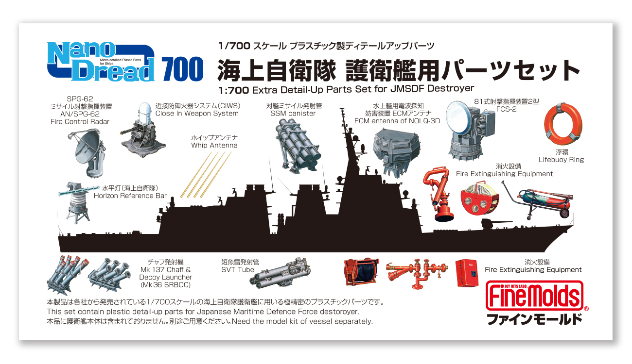 | 極精密プラスチックパーツ「ナノ・ドレッド」シリーズより、イージス艦を始めとする海上自衛隊の護衛艦が装備する各種パーツをまとめたお得なセット。ヘリコプター搭載型護衛艦やミサイル護衛艦などの各護衛艦、および現用米海軍艦艇の一部にも適合します。1隻分入り、組み合わせによっては2隻分フォローできます。限定品。 |