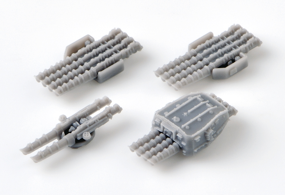 日本海軍の代表的な魚雷発射管のセット。九二式四連装発射管(シールド付/無の選択式)と八年式連装発射管を立体化。