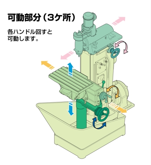 キットの精密性はもちろん、各ハンドルを回すことにより加工テーブル、ヘッド部が可動します。