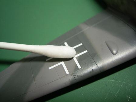 | コックピットは全面をブラックグレーでエアブラシ塗装後、細部をエナメル塗料で筆塗りします。計器盤は塗装で仕上げてもよいですが、今回はデカール仕上げで行っています。計器盤モールドの凹凸に密着させるためにマークソフター(デカール軟化剤)を使用します。 |
