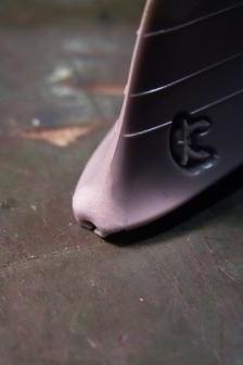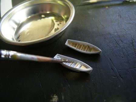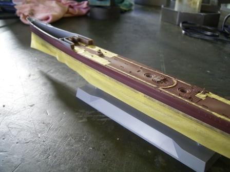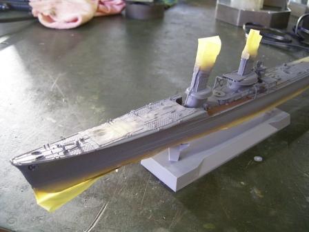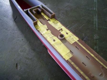 リノリウム部分をマスキングし終えた船体。