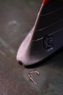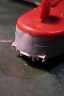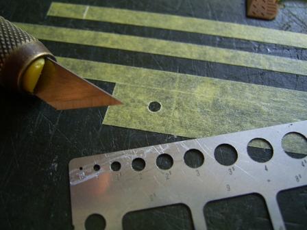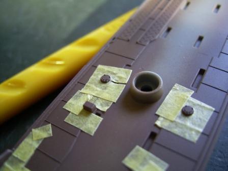 | 次に艦底色&軍艦色を塗るために、リノリウム色で塗装した部分をマスキングをします。船上の突起(構造物や艤装品)部分までマスキングしないようにテンプレートを使用してテープをカットしていきます。 |