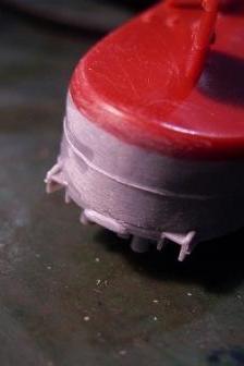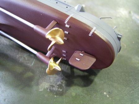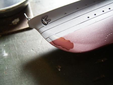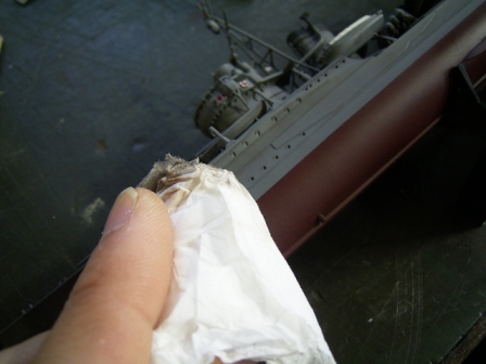 | リノリウムをマスキングした後、艦底色を塗ります。艦底色もマスキングするので、はみ出しは気にせずに塗ってOK。塗装後マスキングします。マスキングはなるべくキッチリと。 |