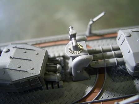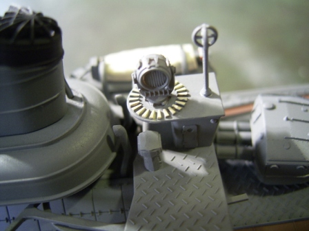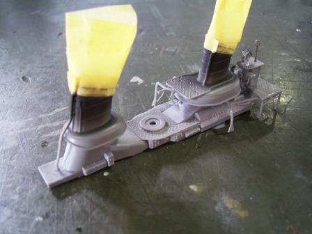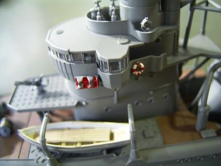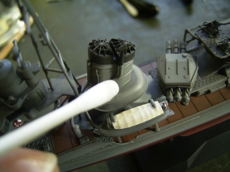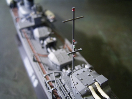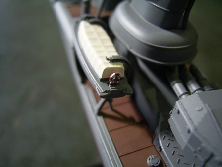 船体に接着する前に中央構造物を単独で組み上げたのは、機銃座などの裏側を塗装しやすくする為と、軍艦色の塗装工程をなるべく一度に済ますためです。 |