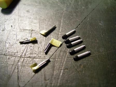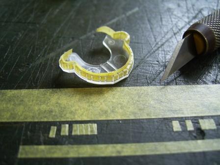 窓もリノリウム部分のマスキングと同じく細切りのマスキングテープでマスクします。窓内側のマスクも忘れずに。 |
