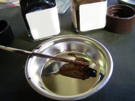 まずリノリウム色を塗装します。写真のように船首楼(せんしゅろう=船首の一段高くなっている部分)の甲板を接着する前に塗装します。