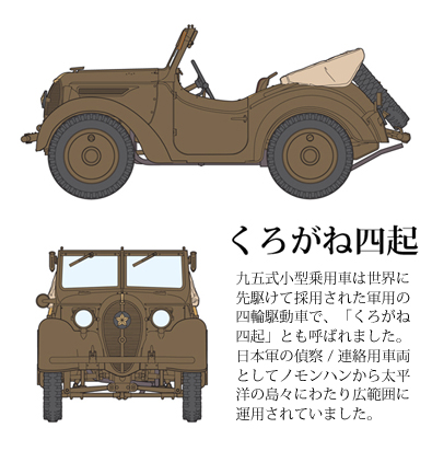 また、同スケールの帝国陸軍の乗用車である九五式小型乗用車『くろがね四起』のキットが付属します。