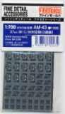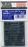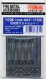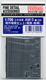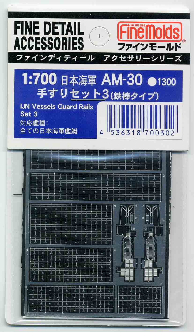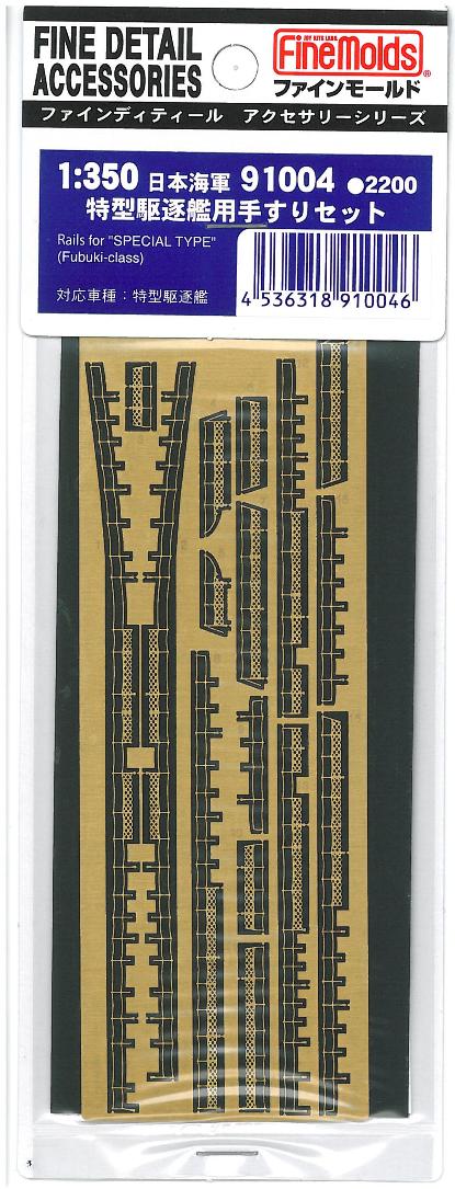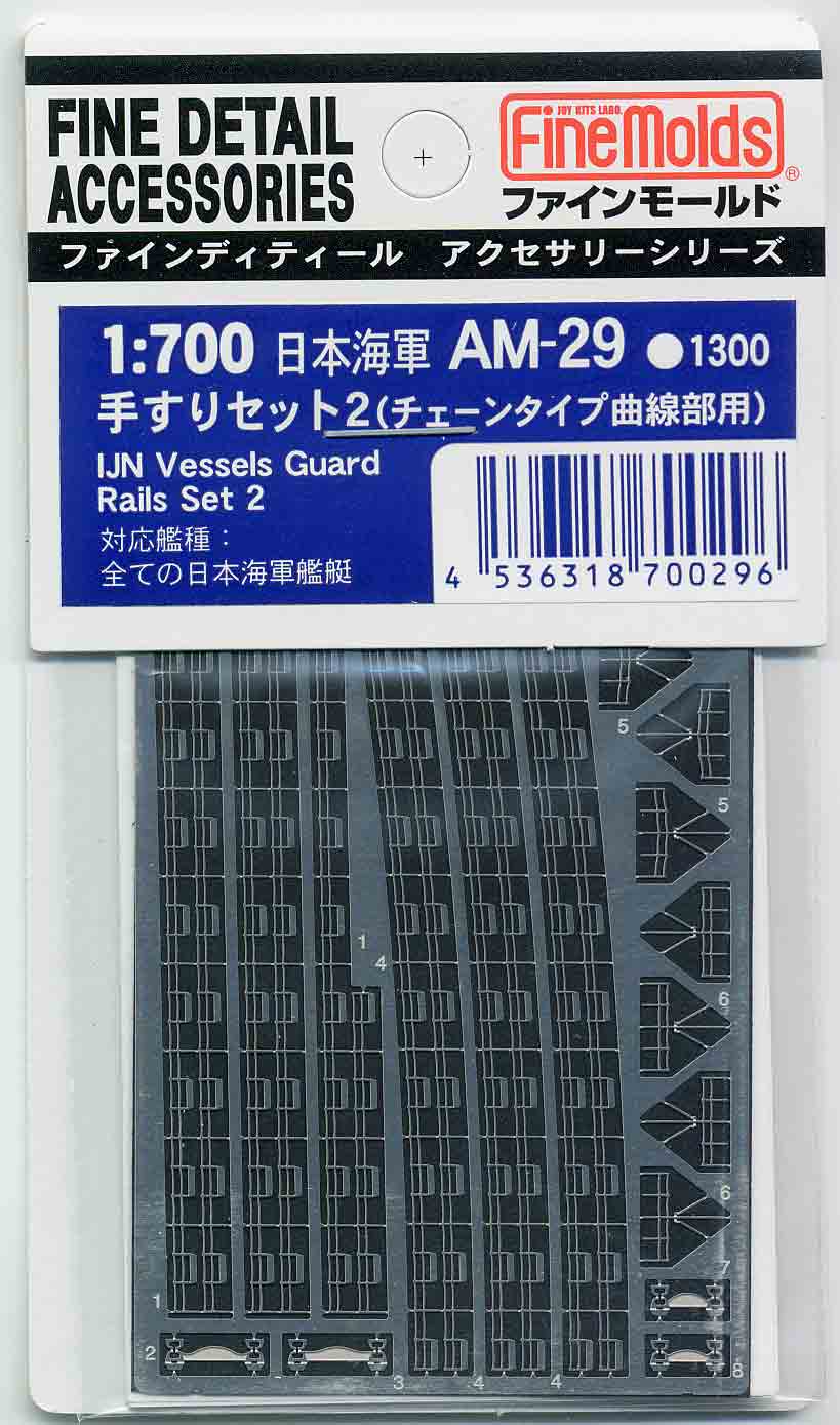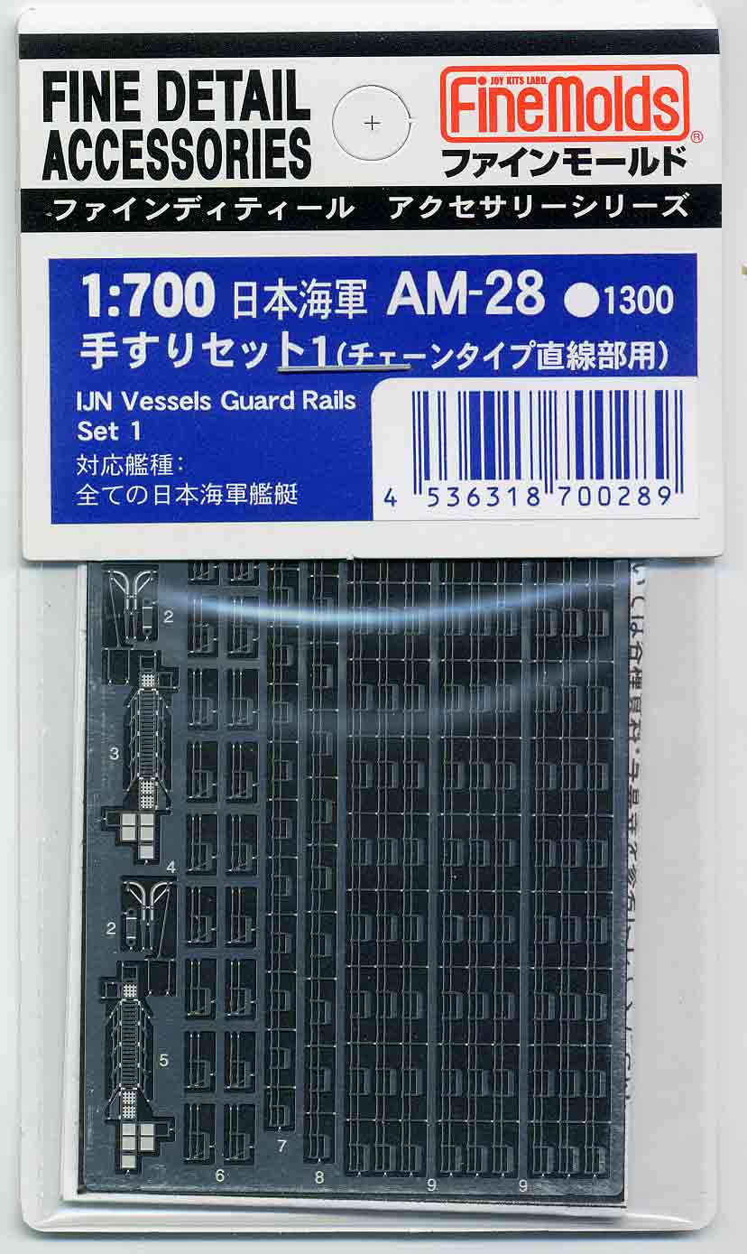 日本海軍・手すりセット1(チェーンタイプ直線部用)(エッチング) 日本海軍艦艇特有の2本組手すりを再現。艦艇周囲ならびに大砲周辺部等は、作業・戦闘時に折り畳むため手すりにはチェーンが使われていました。セットには重巡用の舷梯(洋上での乗艦用はしご)と専用ダビットを付属。 |