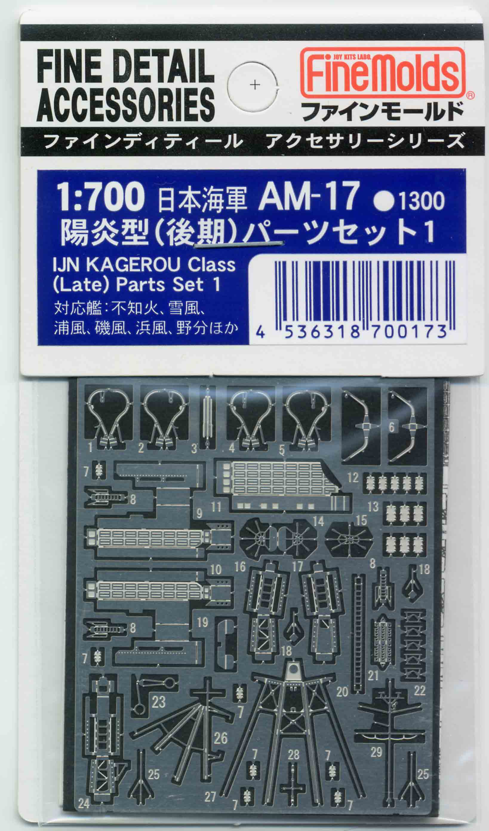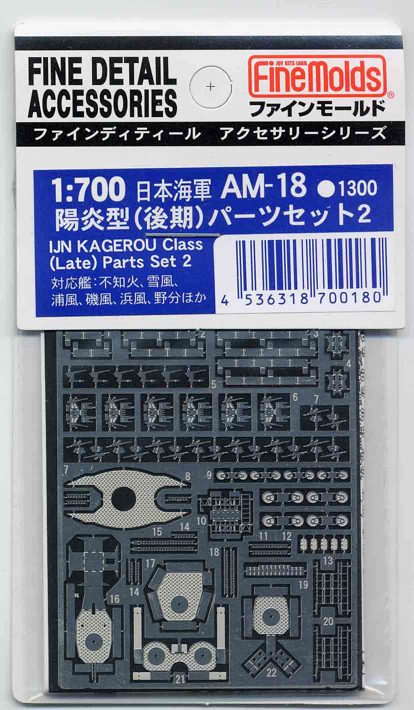 日本海軍・陽炎型パーツセット2(後期)(エッチング) 防弾鋼板付の機銃座や後部甲板の爆雷装填台、爆雷投下軌道、25ミリ機銃など、陽炎型駆逐艦の武装パーツを中心にセットしています。 |