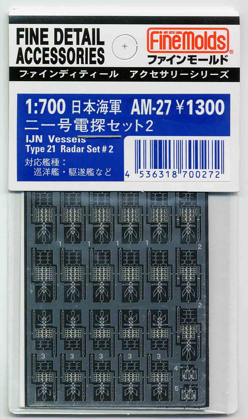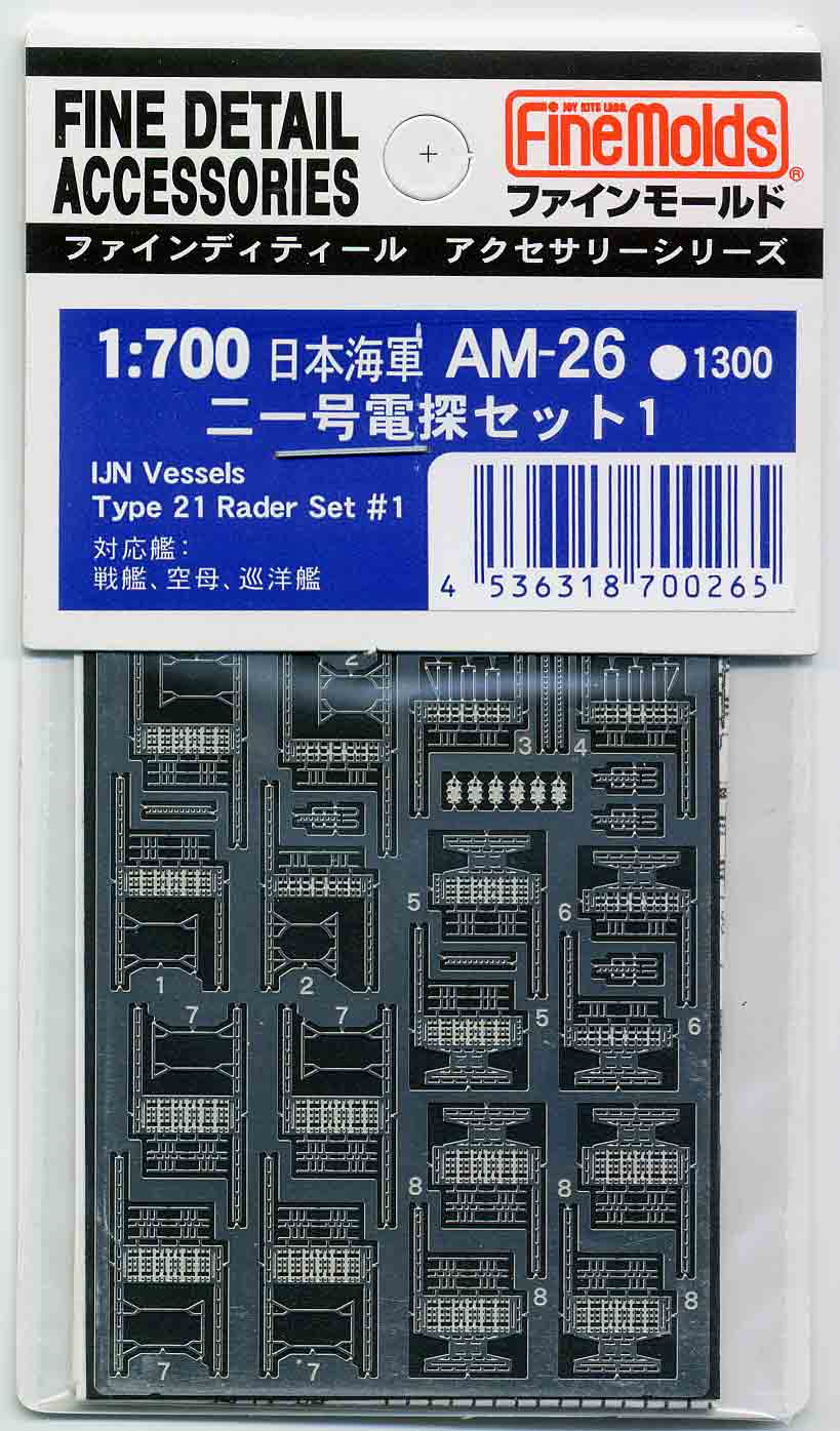 日本海軍・ニ一号電探セット1(エッチング) 主に戦艦や空母で使用された二型、三型、四型をセット。測距儀に取り付ける場合の支柱も一体化。大和・武蔵用の専用パーツ入り。 |