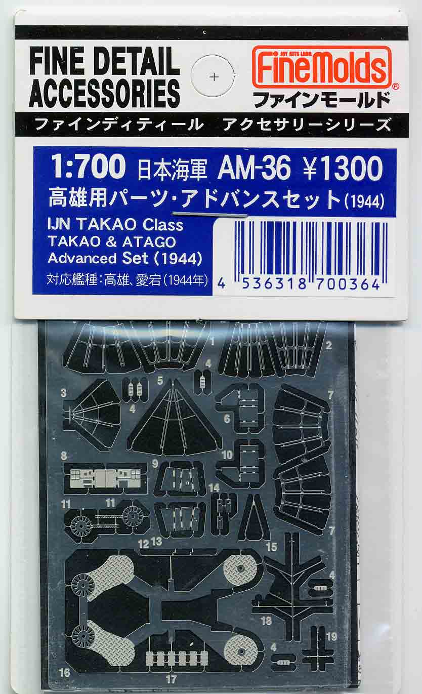 日本海軍・高雄型パーツ・アドバンスセット(1944) (エッチング) 重巡洋艦「高雄」・1944年当時の状態を特に精密に再現するパーツです。艦中央部の機銃台と機銃台櫓(支柱)を中心に再現します。姉妹艦・愛宕にも使用可能です。AM35とともにお使いください。 |