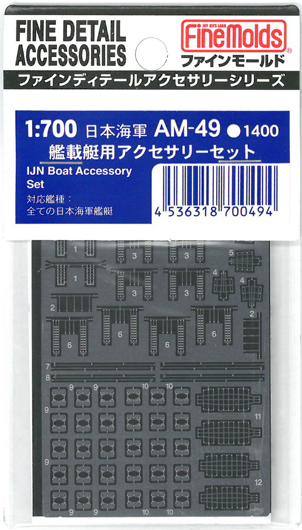 日本海軍・艦載艇アクセサリーセット 日本海軍艦艇に搭載されたボート・小型船舶関連の精密さを一層引き立てるエッチングパーツ。搭載艇の架台や、ダビットに据えられていた縄梯子・安全索、おまけの柄信号標識板などをセットしています。 |